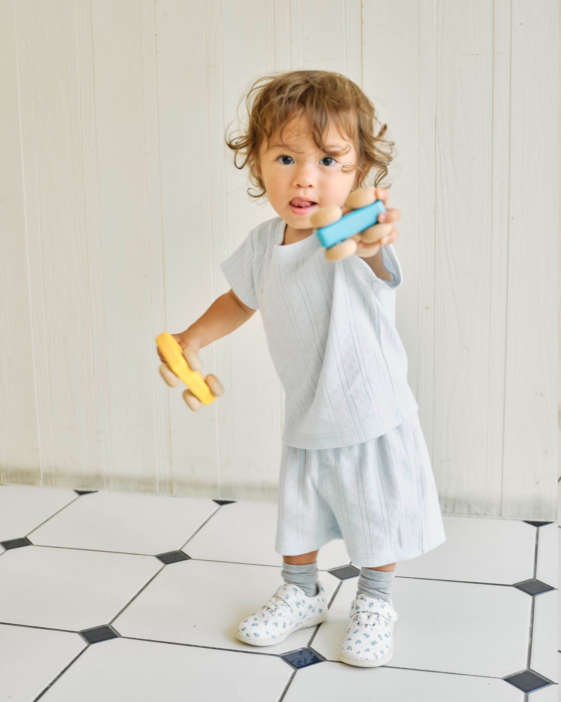 着脱のしやすいショーツとオリジナルのT-シャツのセットです。同じデザインのセットアップ(同サイズ)のご用意になります。知り合いにお子様が産まれる、友人への出産祝いに。などギフトに選んでいただくことが増えたので、セットで購入していただくよりも少しお買い得な価格にしてご用意しています。