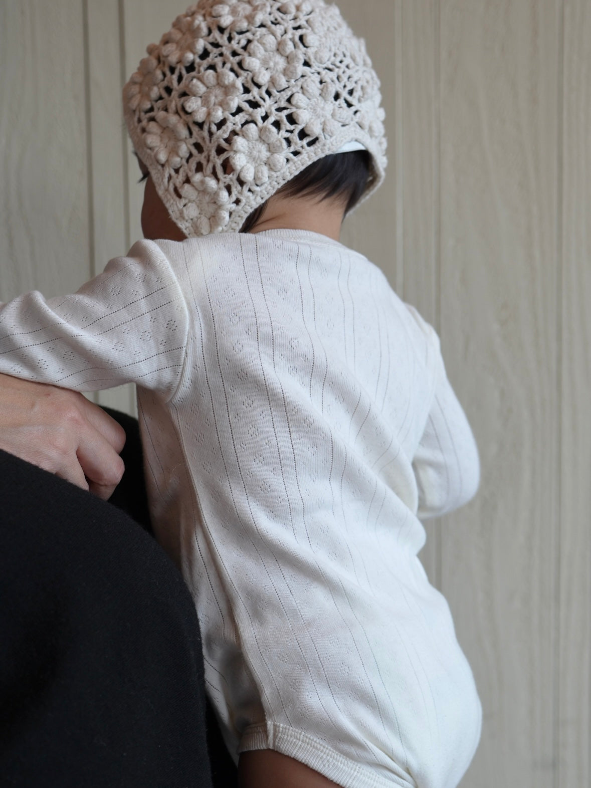 春夏に発売したアイスブルーとブラックの秋冬バージョンで登場。eyelet生地を使用しており、戦後の1940年代ごろの主にフランスにおいてベビー用品のインナーウェアに多く使われていたものです。