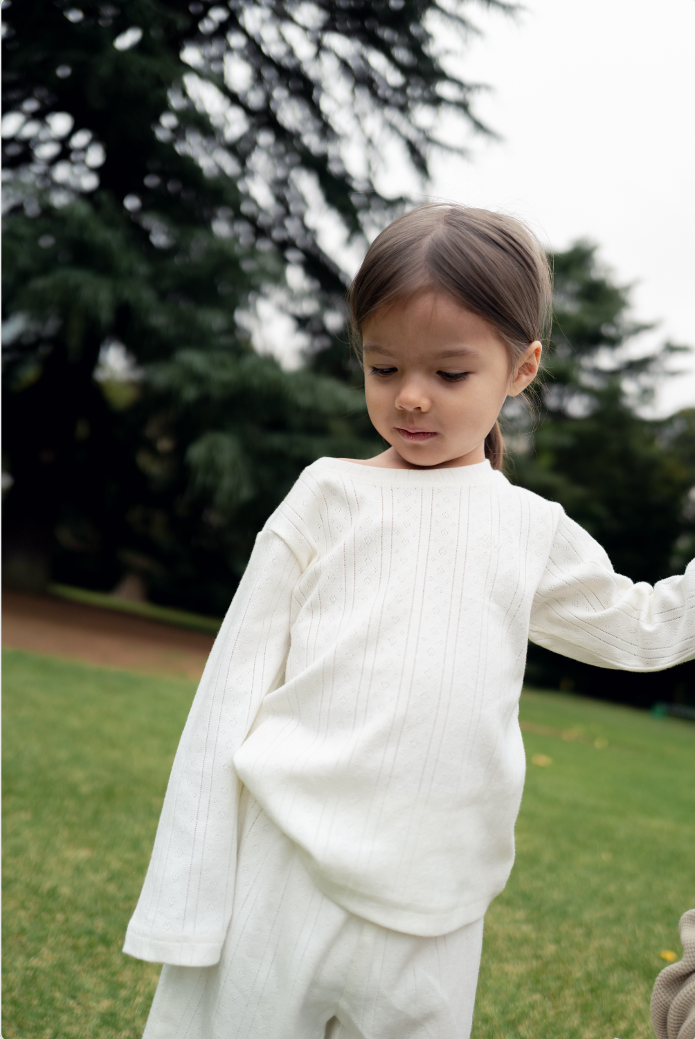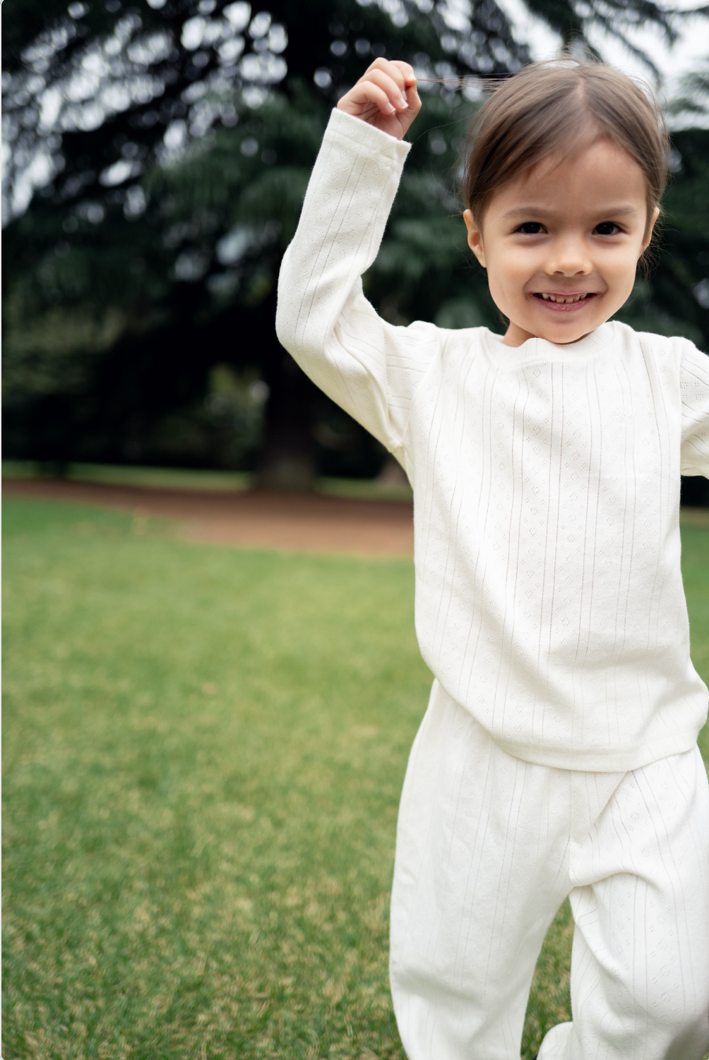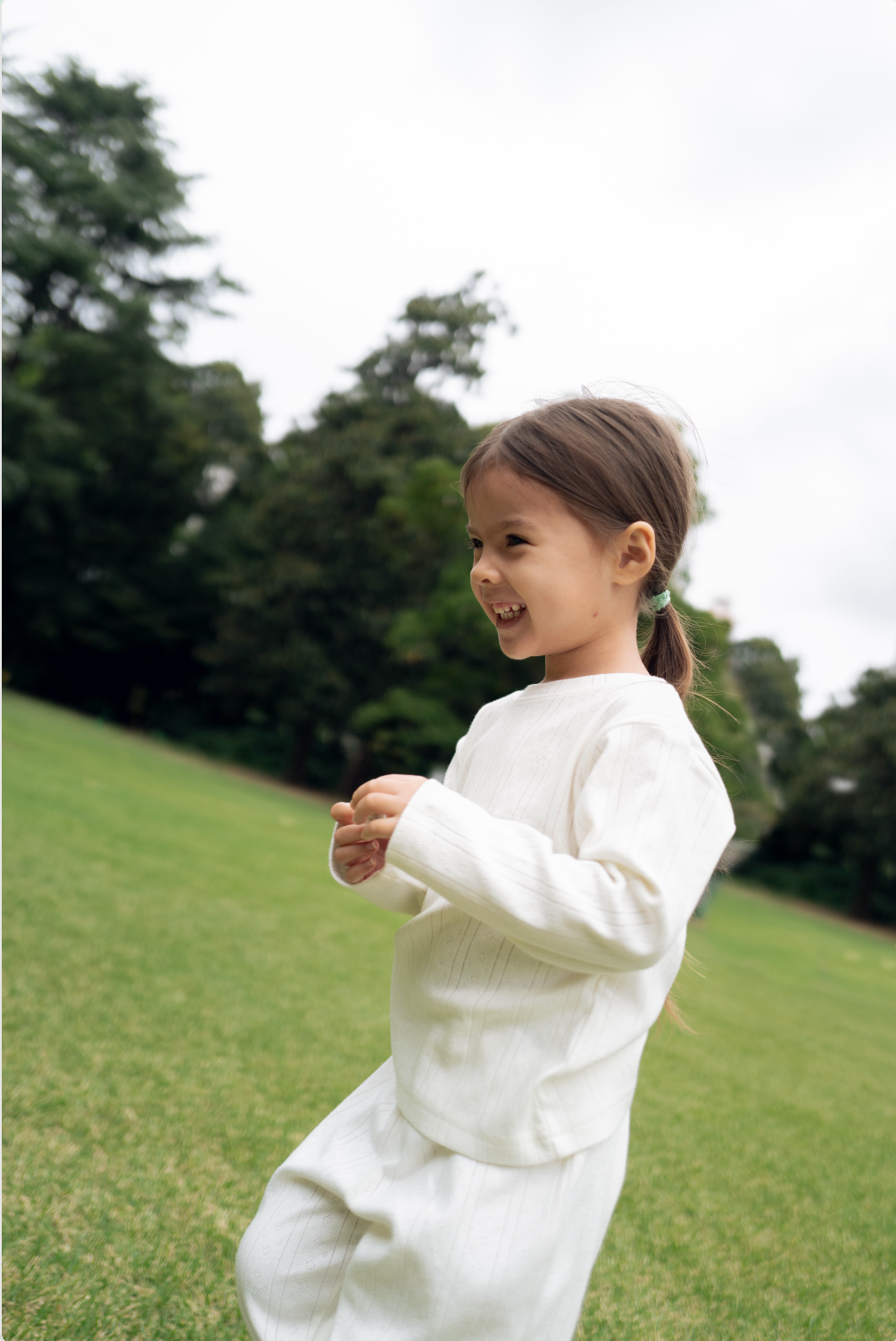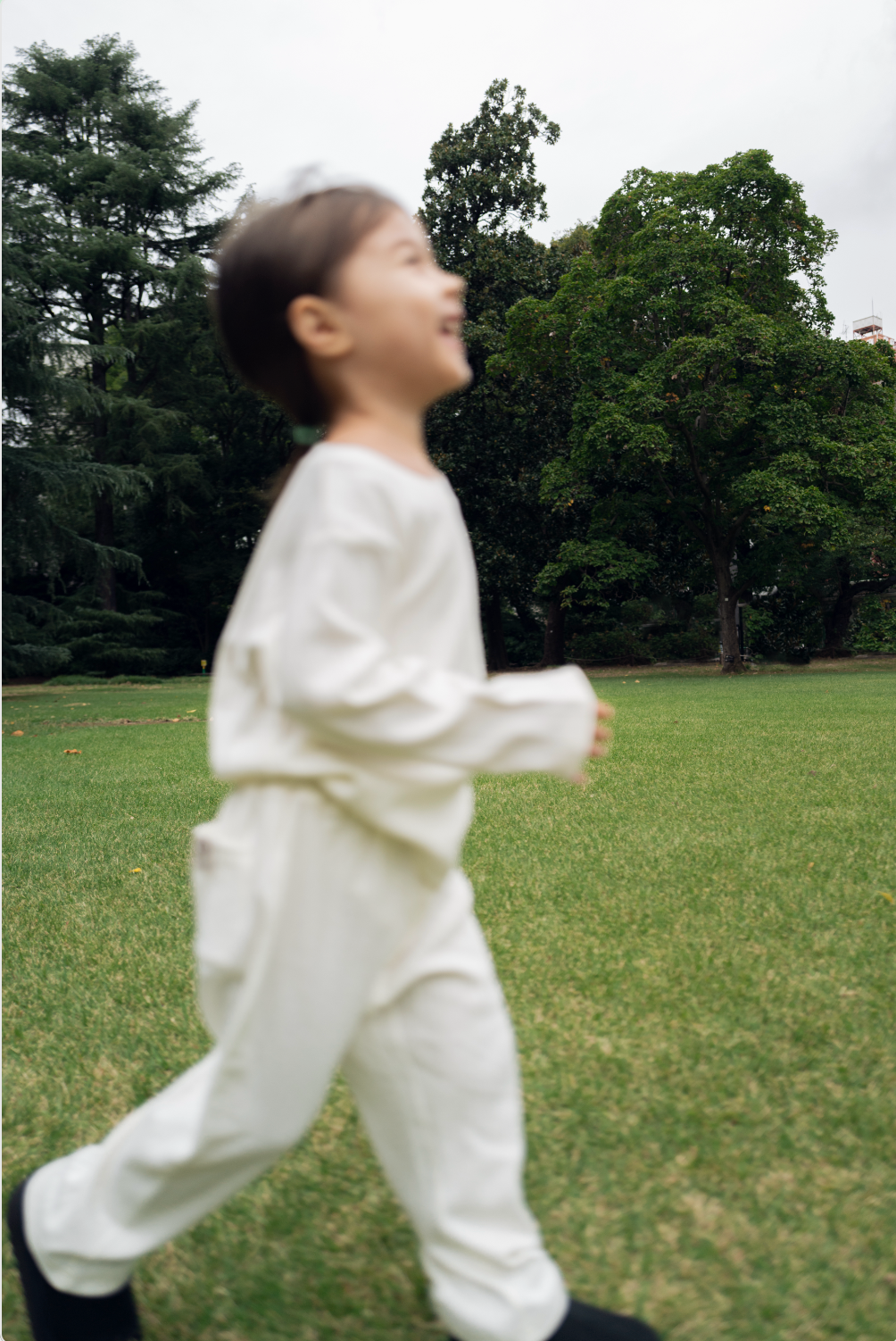 真っ白ではなく、生成りの白のセットアップ。子供に着せるのは少し勇気がいる色味ですが潔くおしゃれのために着せてみてください。とても可愛い自信作です。