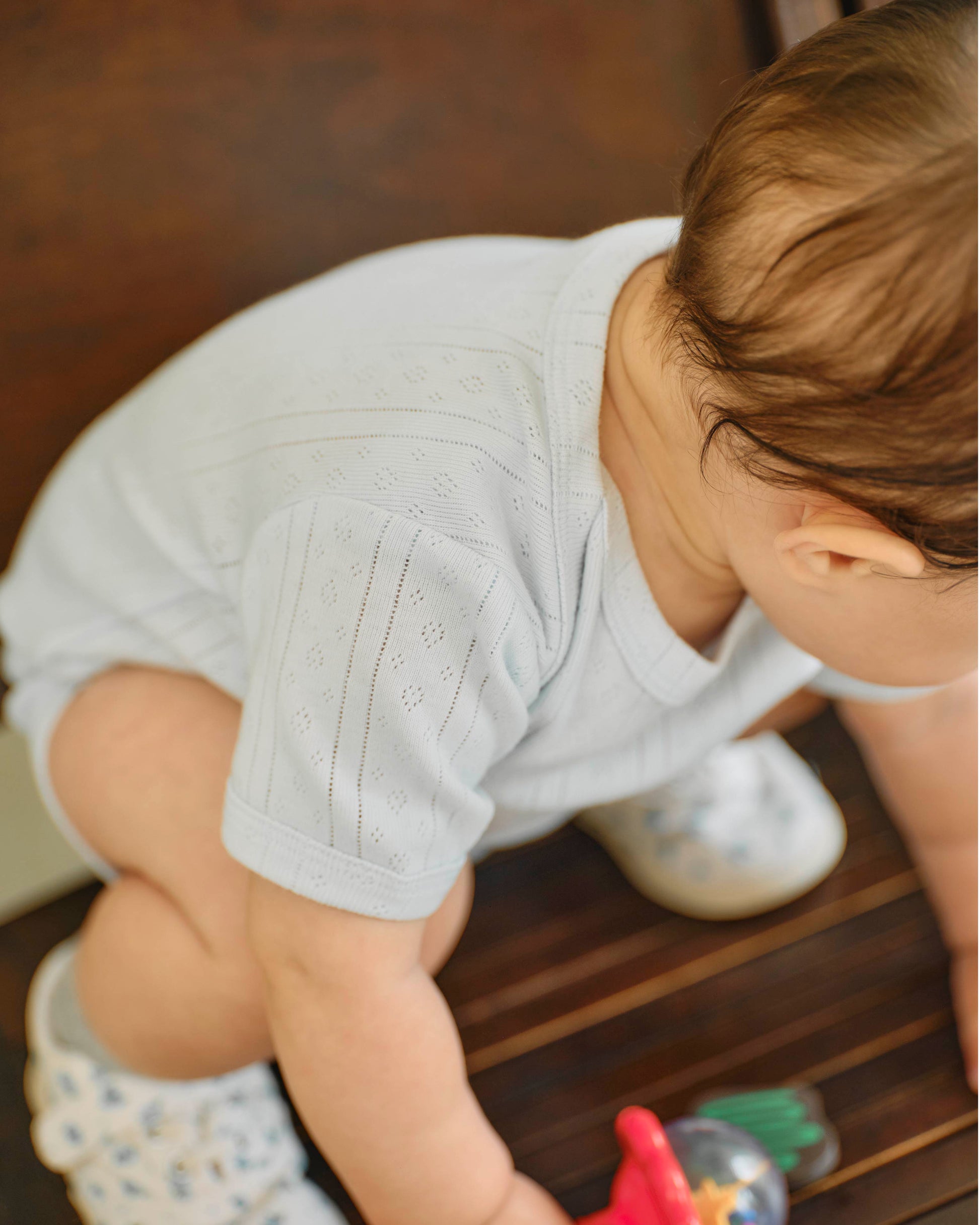 袖口がほんの少しだけ細くなっていて腕が細く見えたり(赤子には要らない要素かも)します。うっすらブルーなのがこだわりポイントで、暑い夏に涼しげに着ていただきたいです。