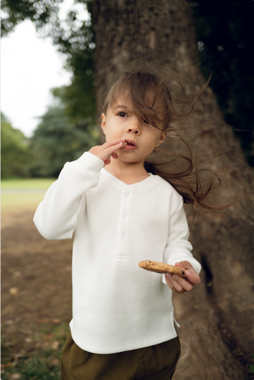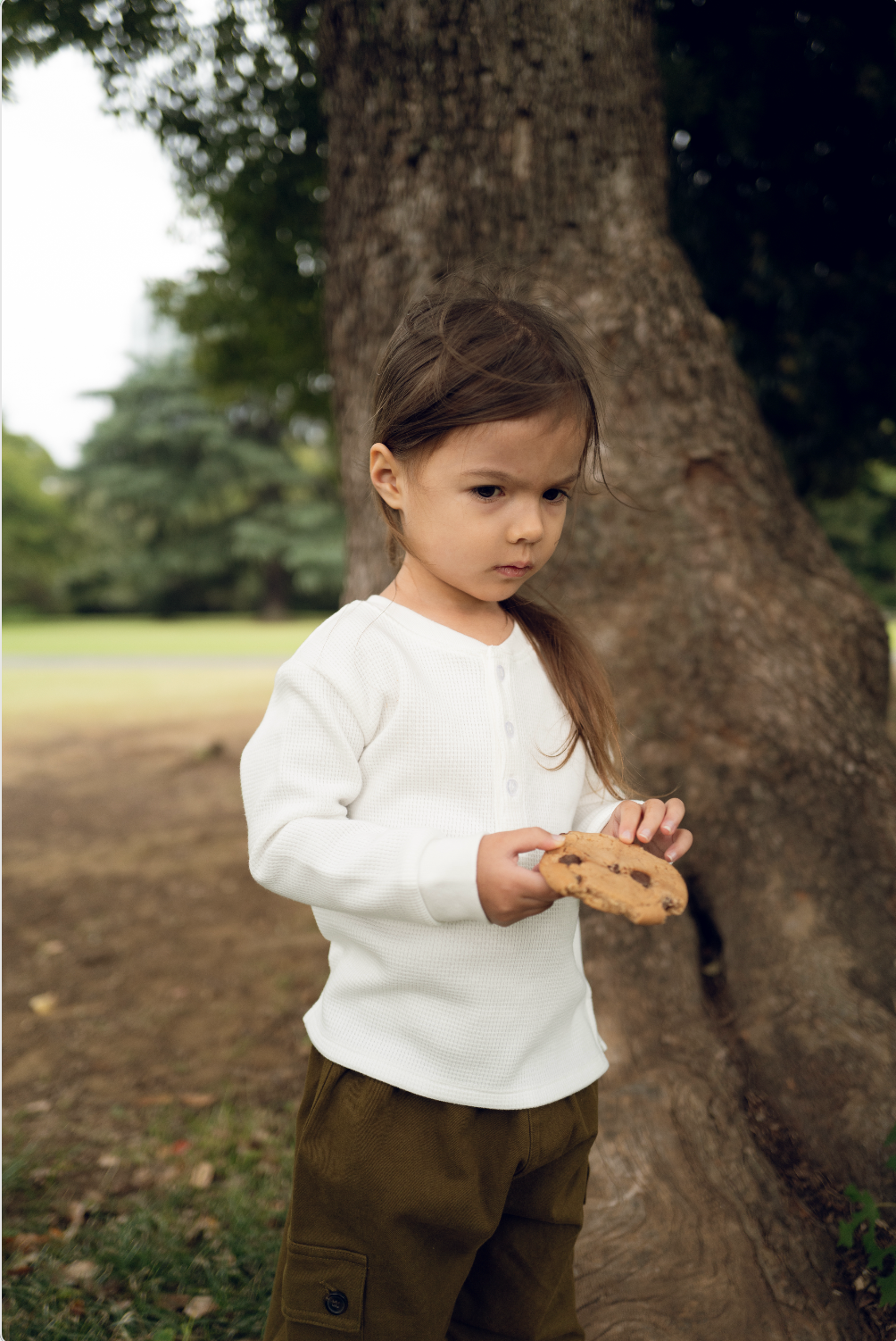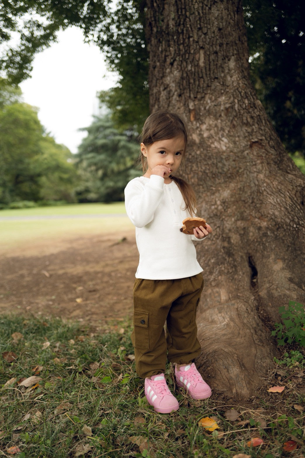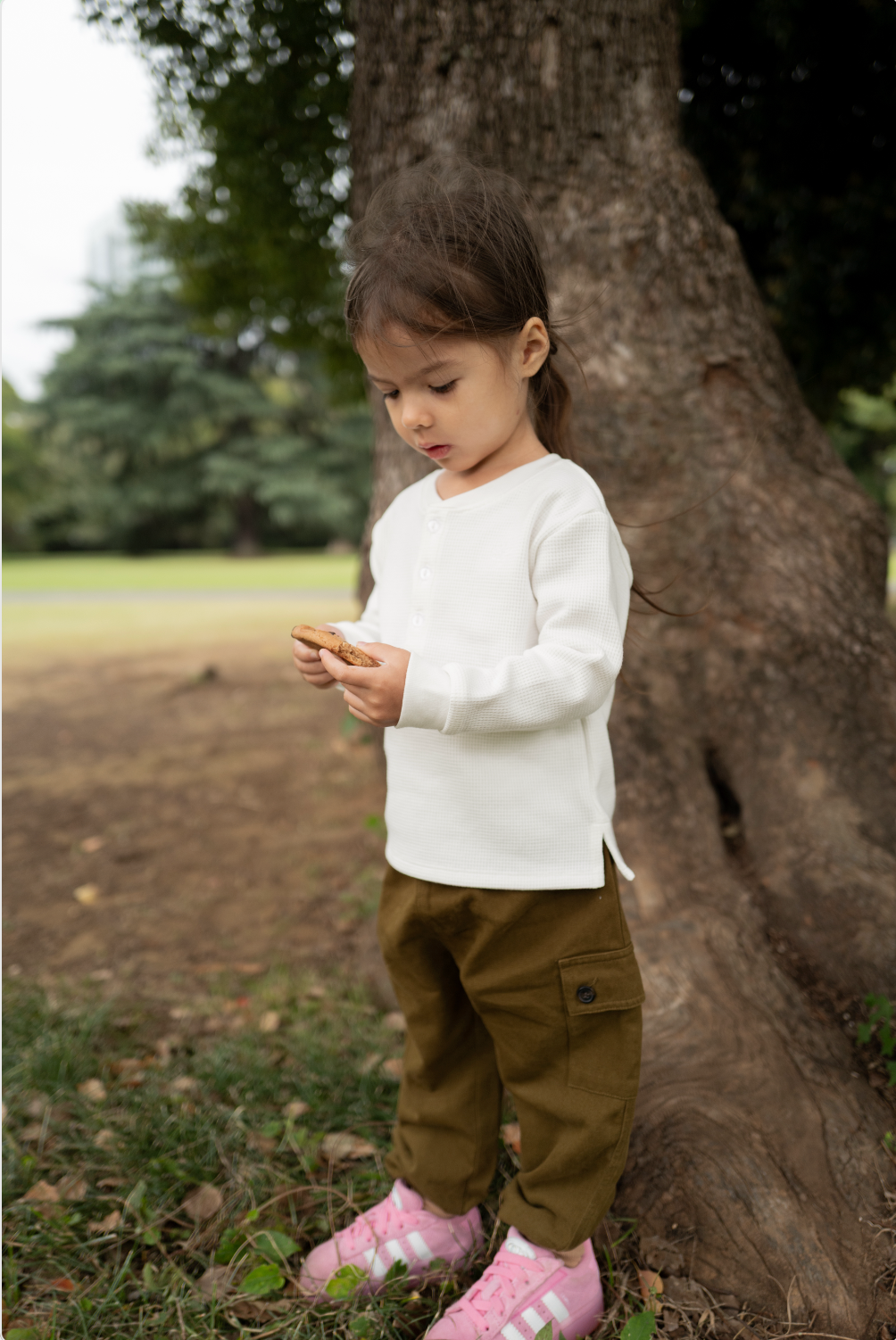 パンツの裾部分にはゴムを入れており、歩きやすさも重視。サーマルはなるべく地厚なものを選んだので、一枚で着ても子供服には中々ないサイドポケットの作りだったり、シルエットを楽しんで着ていただきたいです。