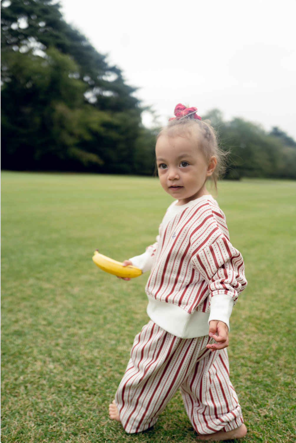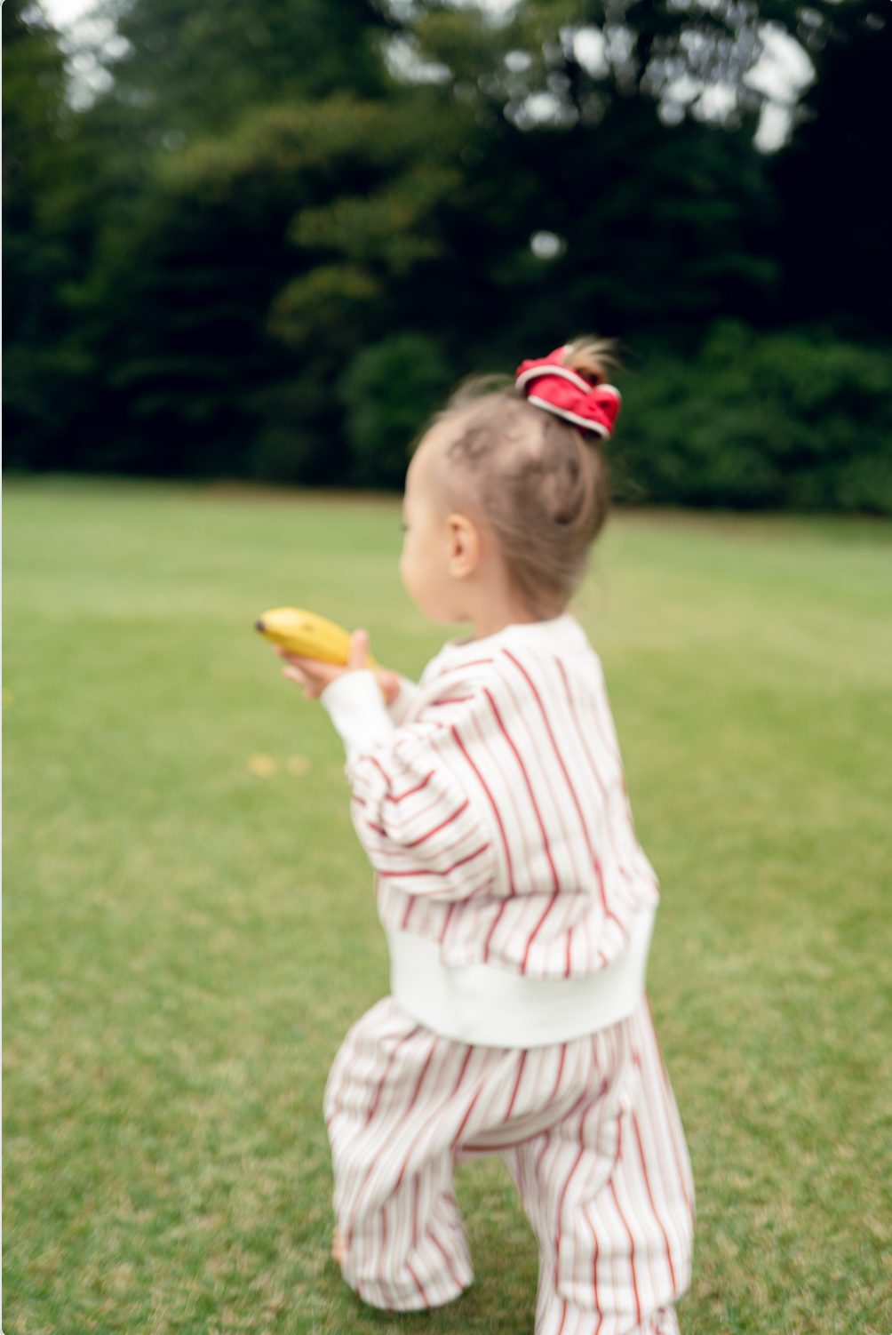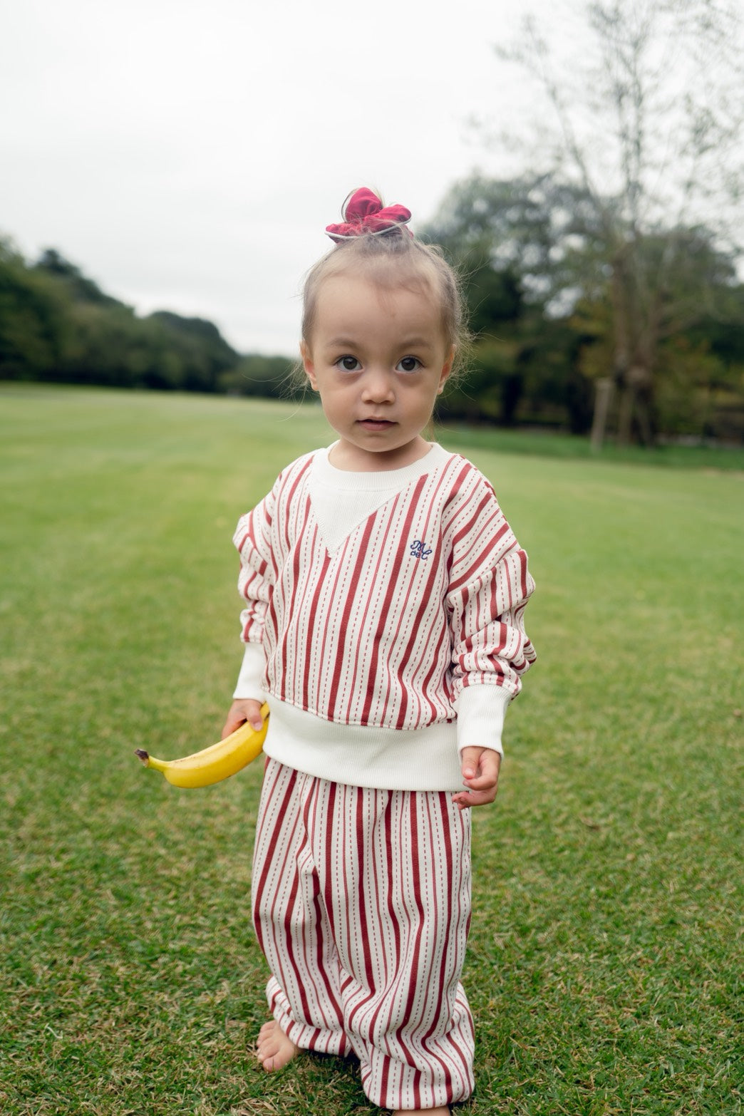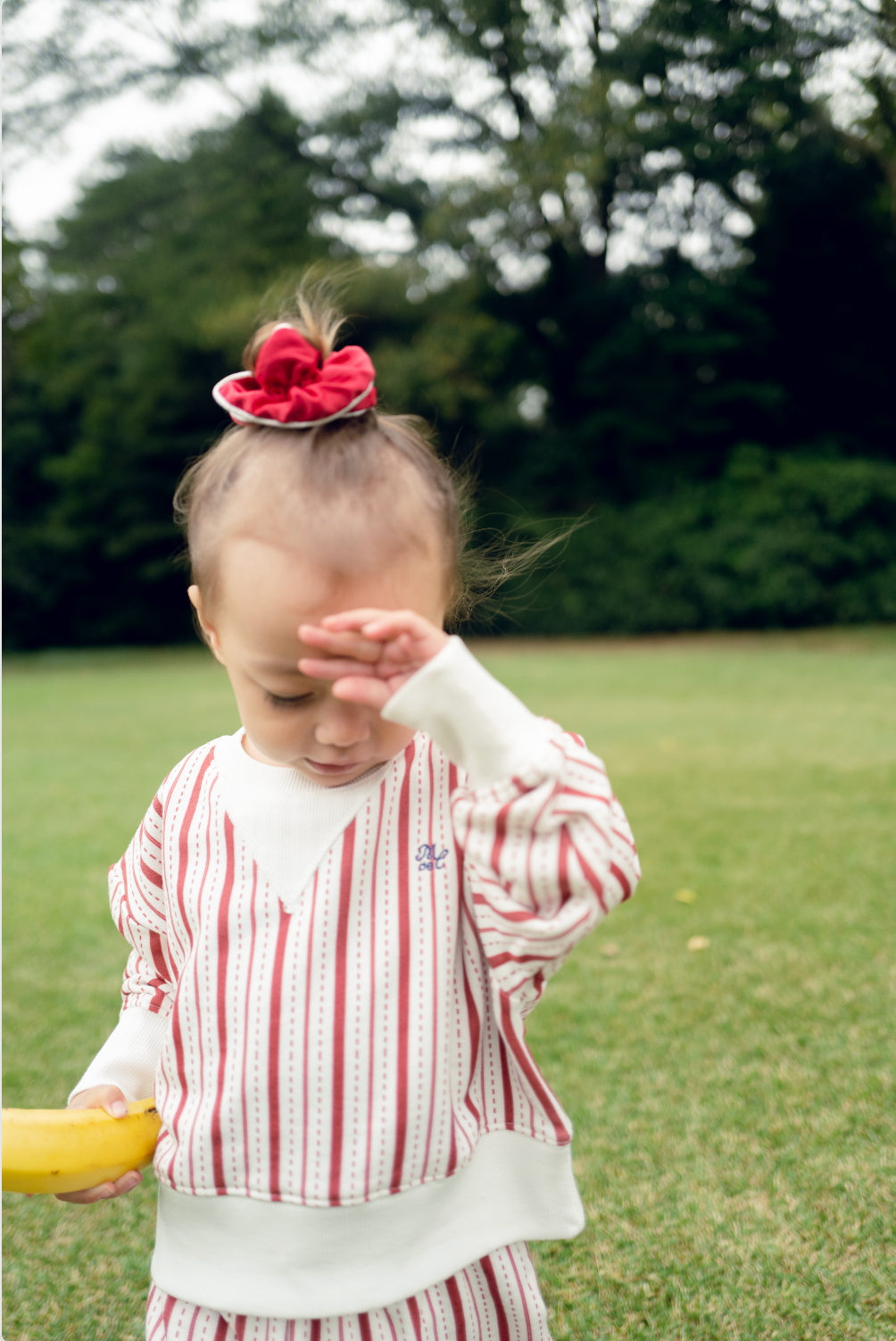 ストライプデザインは、ストライプ幅を1からデザインして完全オリジナルにしました。通常子供服はプリントされたものが主流の中、染み込みプリント。色褪せる過程まで楽しんでもらうために、こだわったポイントです。