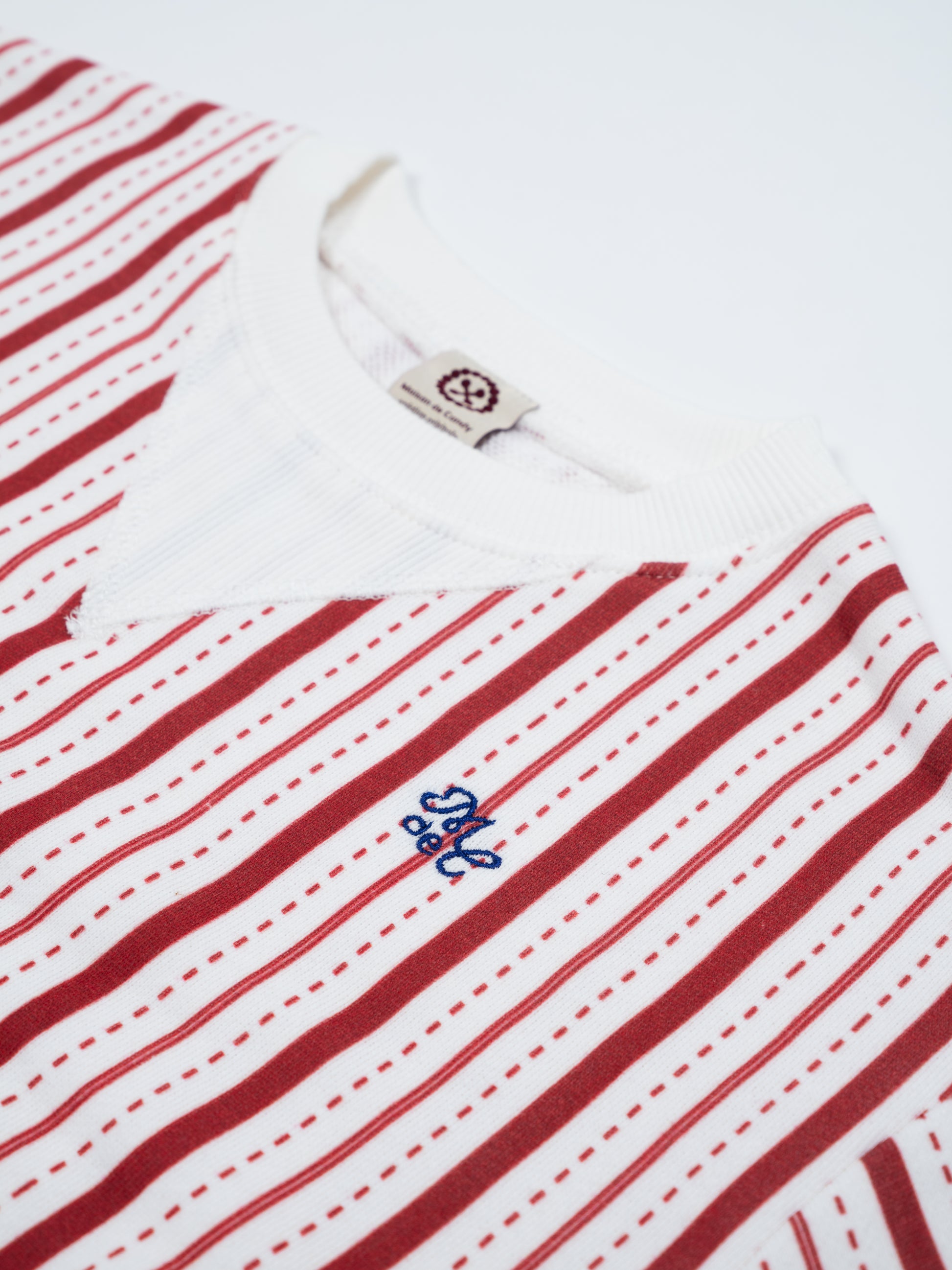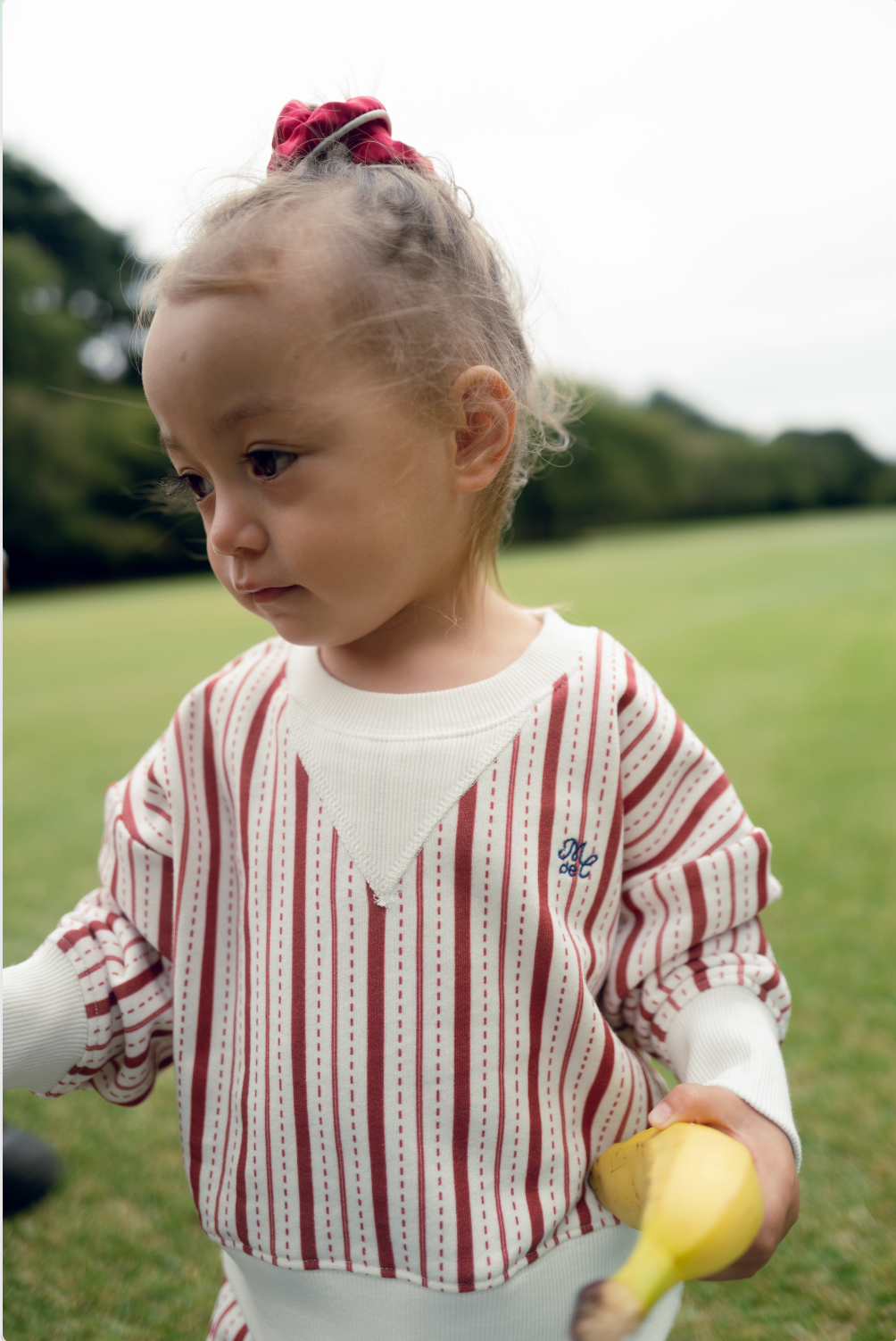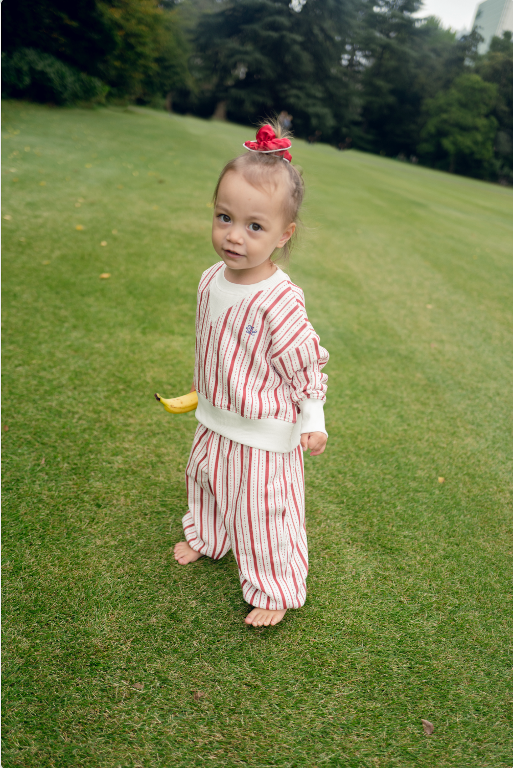 ストライプデザインは、ストライプ幅を1からデザインして完全オリジナルにしました。通常子供服はプリントされたものが主流の中、染み込みプリント。色褪せる過程まで楽しんでもらうために、こだわったポイントです。