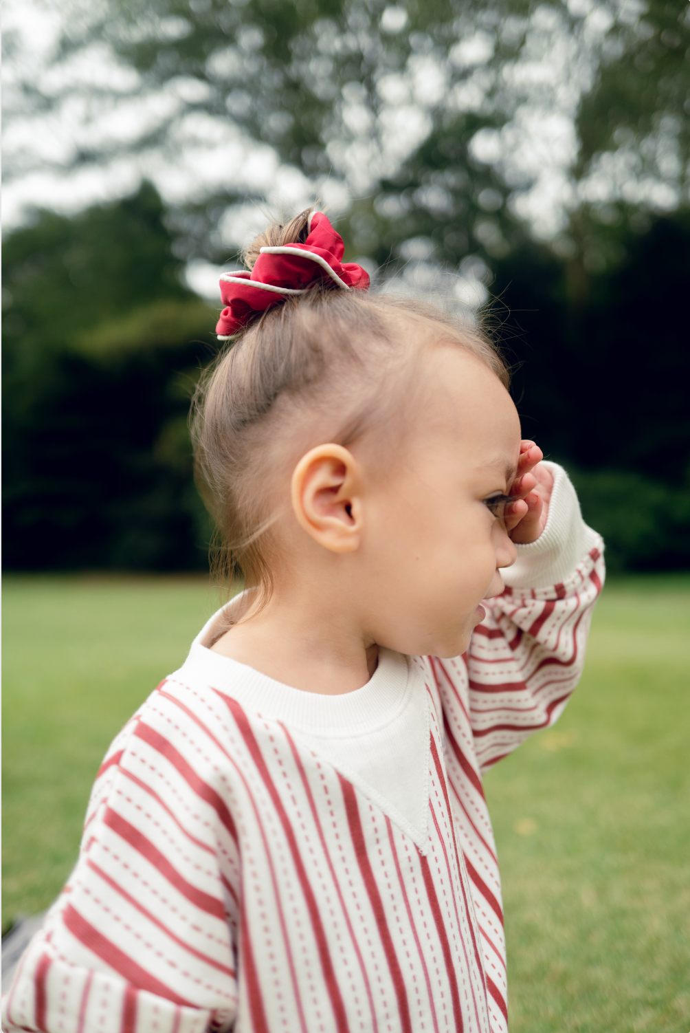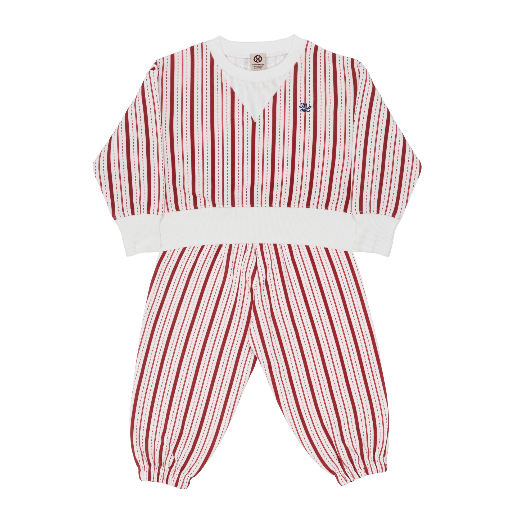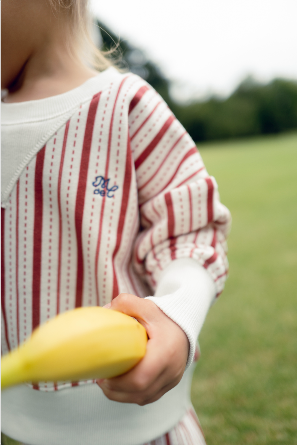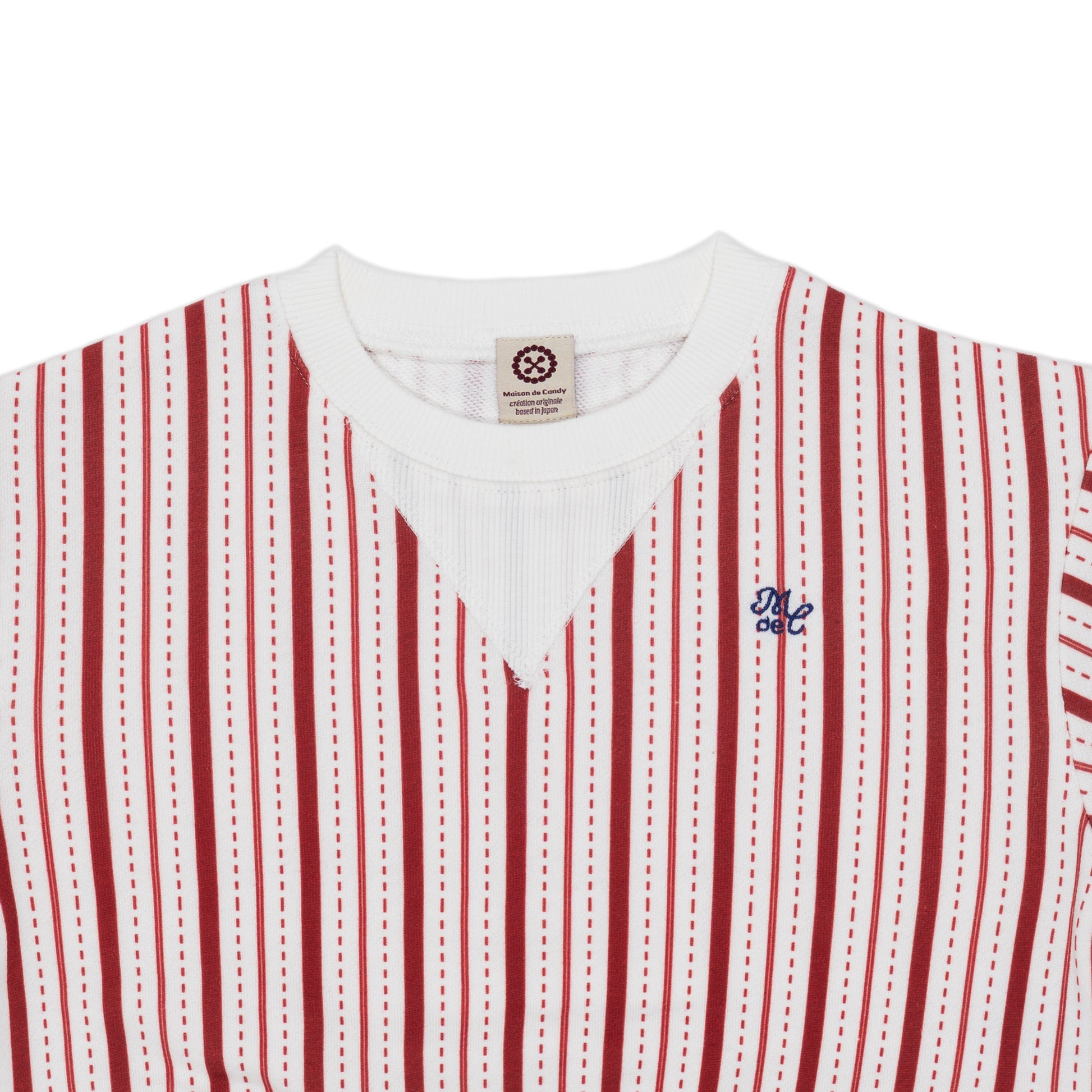 ストライプデザインは、ストライプ幅を1からデザインして完全オリジナルにしました。通常子供服はプリントされたものが主流の中、染み込みプリント。色褪せる過程まで楽しんでもらうために、こだわったポイントです。